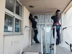 作業員2名が足場上で連携しながら、一つひとつの部材を手作業で取り外していきます。