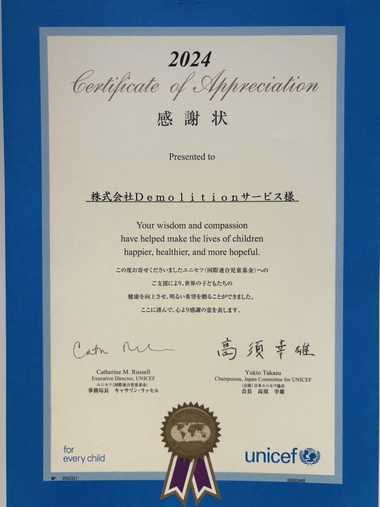 Demolitionサービスは、毎年ユニセフへの募金活動を継続的に行っています。